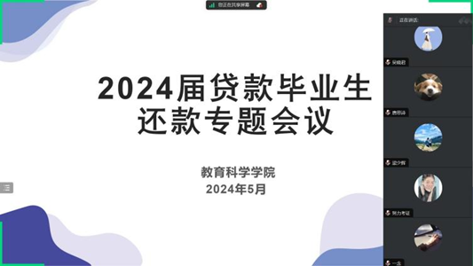 为帮助贷款毕业生了解生源地贷款的相关政策,指导他们做好还款计划以及熟悉还款流程。5月22日晚上8点,教育科学学院举办了2024届贷款毕业生还款指导专题线上会议。学院辅导员陈慧妍、梁少辉、朋辈辅导员龚碧莹以及2024届全体贷款毕业生参加了此次会议。