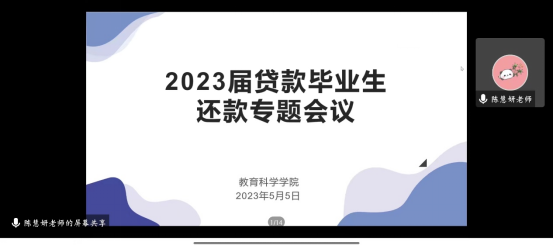 为帮助贷款毕业生了解高校贷款的相关政策,指导他们做好还款计划以及熟悉还款流程。5月5日晚上7点,教育科学学院在腾讯会议举办了2023届贷款毕业生还款指导专题会议。学院辅导员陈慧妍、朋辈辅导员蓝妍妍以及2023届全体贷款毕业生参加了此次会议。