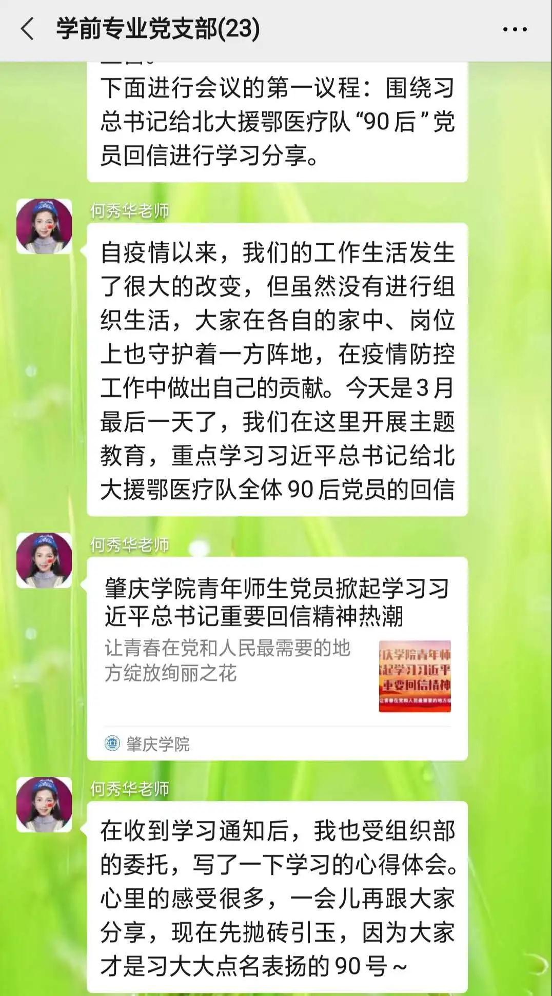 据悉,学前教育专业学生党支部(原一、二年级党支部)于2018年12月被市直机关工委命名为第二批“肇庆市直机关基层党建示范点”。该支部积极响应学校及学院党委在疫情防控期间开展组织生活和党员教育培训工作的指导意见,充分利用线上方式开展组织生活。本次的线上专题学习会,把党支部全体成员凝聚起来,引导青年党员把思想和行动统一到回信精神,落实到学习、生活的方方面面,让身边的人看得到、感受得到,并影响身边的人,让青春绽放绚丽之花。