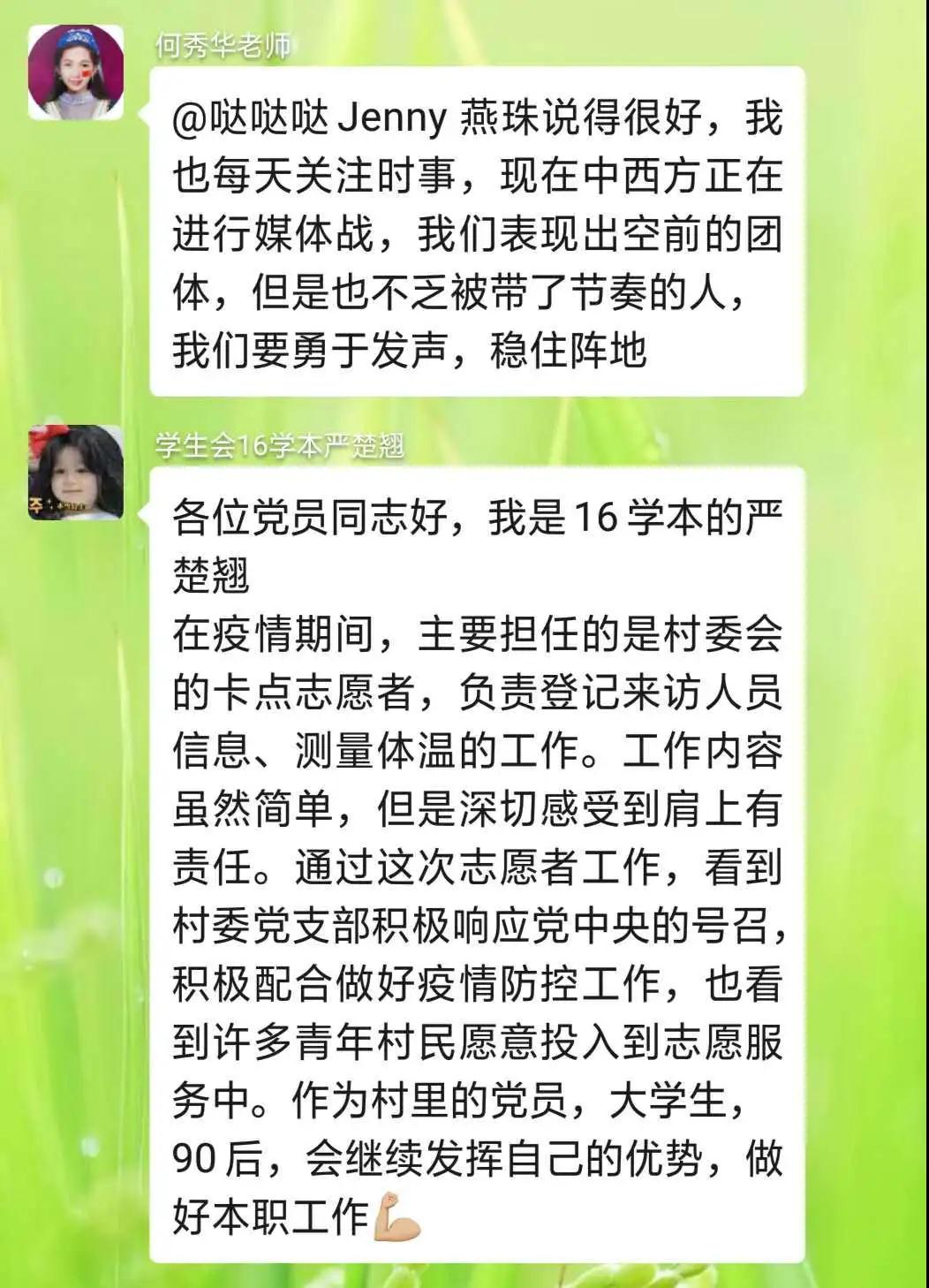 与会党员结合自己在疫情期间的志愿活动、备考研究生复试、备考专插本考试、求职、学习等方面的感悟,积极分享学习回信精神的心得体会,并进行互相评议,现场气氛热烈,文字间洋溢青年党员的蓬勃朝气、浩然正气以及党员同学间的真挚友谊。何秀华老师也对同学们的发言进行有针对性的点评。