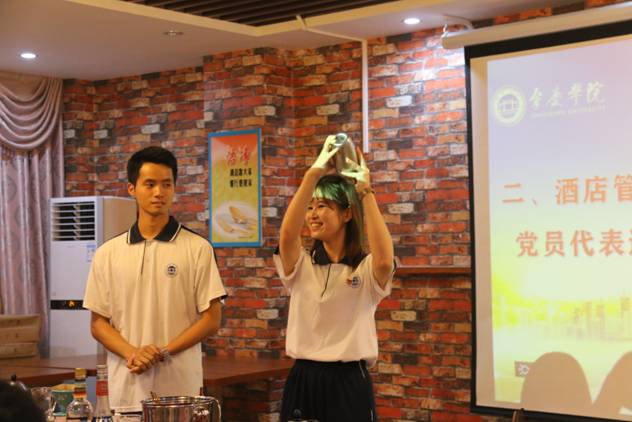 活动的第二站来到旅游与历史文化学院。双方先是观看宣传栏,感叹旅游学院新闻工作更新之及时。在中西餐厅实验室里,双方观看学生作品《府城复兴》宣传片,了解肇庆发展、致敬家国梦想。学生代表现场展示了冲泡咖啡、茶艺、调酒的专业技能,充分展现专业的魅力。