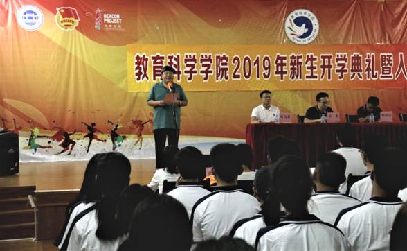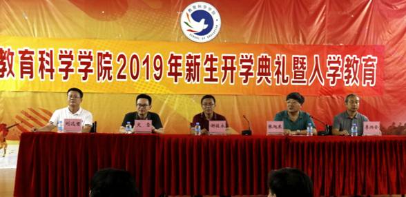 本网讯(通讯员 陈颖棋)良好的开端是成功的一半,为让教科院2019级新生尽快适应角色转换,顺顺利利地开启大学生活,2019年9月9日,教育科学学院2019级新生开学典礼暨入学教育在星湖小礼堂举行。学院党委书记谢佐永、院长张旭东、副院长文雪、李炳全、学院党委副书记刘远君、各专业系主任、辅导员、带班党员及教科院2019级全体新生参加大会。刘书记担任主持人。