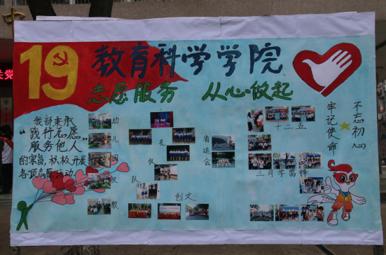 本网讯(通讯员 张立婷 詹妮 责编 卢巧丹)12月5日是国际志愿者日,为积极响应校团委“践行志愿者使命,争做优秀志愿者”的号召,教育科学学院团委青年志愿服务部分别于12月5日在星湖校区和12月8日在主校区举办了主题为“志愿服务,从心做起”的志愿活动成果展。本次活动旨在提高大学生的思想道德素质,传递大学生的奉献服务精神。
