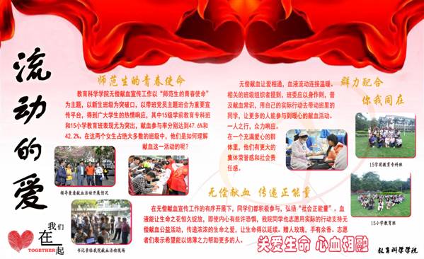 为纪念“6.14”世界献血者日,深入宣传并贯彻落实《中华人民共和国献血法》及相关文件精神,切实加强和改进大学生思想教育工作,学校于5月11日至5月25日举办了“血液连接你我”无偿献血系列活动。我院积极参与各项活动,为学校无偿献血工作做出了贡献,在“血液连接你我”无偿献血宣传系列活动中获得无偿献血海报评选活动二等奖,王丽婷等同学受到了表彰。