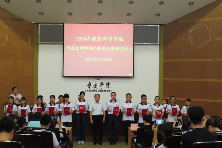 本网讯(记者叶莹茵 马晓玲)5月28日下午4:30,教育科学学院在学术报告厅举办了2016年师范生教师综合技能大赛颁奖仪式。校党委副书记、纪委书记黄劲松,校党委委员、教务处处长丁孝智,校党委学生工作部部长、学生处处长陈向荣,校团委书记肖俊霞,教育科学学院院长张旭东、党委书记徐杰、副院长文雪、副书记刘远君等领导出席了颁奖仪式。