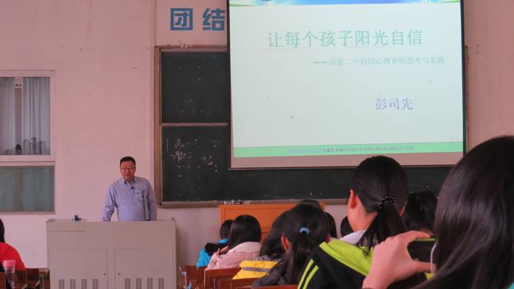 彭校长为在座学生介绍了高要二中近况,并透析教育问题,从而获得的教育、生命价值思考,向我们证明自信心教育的可行性。彭校教予的多元智能理论告诉我们要承认每个学生都有过人的才能,相信每一个学生,并不断给予信心与支持,这样才能让每个孩子拥有自信,拥有更美的人生。