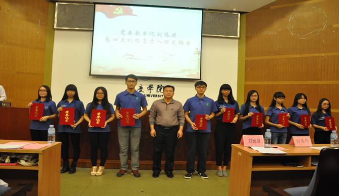 本次会议在激昂慷慨的团歌中拉开了序幕。一段精心准备的视频,我们看到了过去一年学生干部们的成长与蜕变。校青志中心代理副主任李瑜同学作为校学生干部代表发言,她充分肯定了我院学生机构在志愿者服务、西部计划招募等工作中的突出表现,并分享了她三年的学生干部生涯的经验和感受。她以“水”作喻希望大家学习水的宽容,做如水般清明的人。