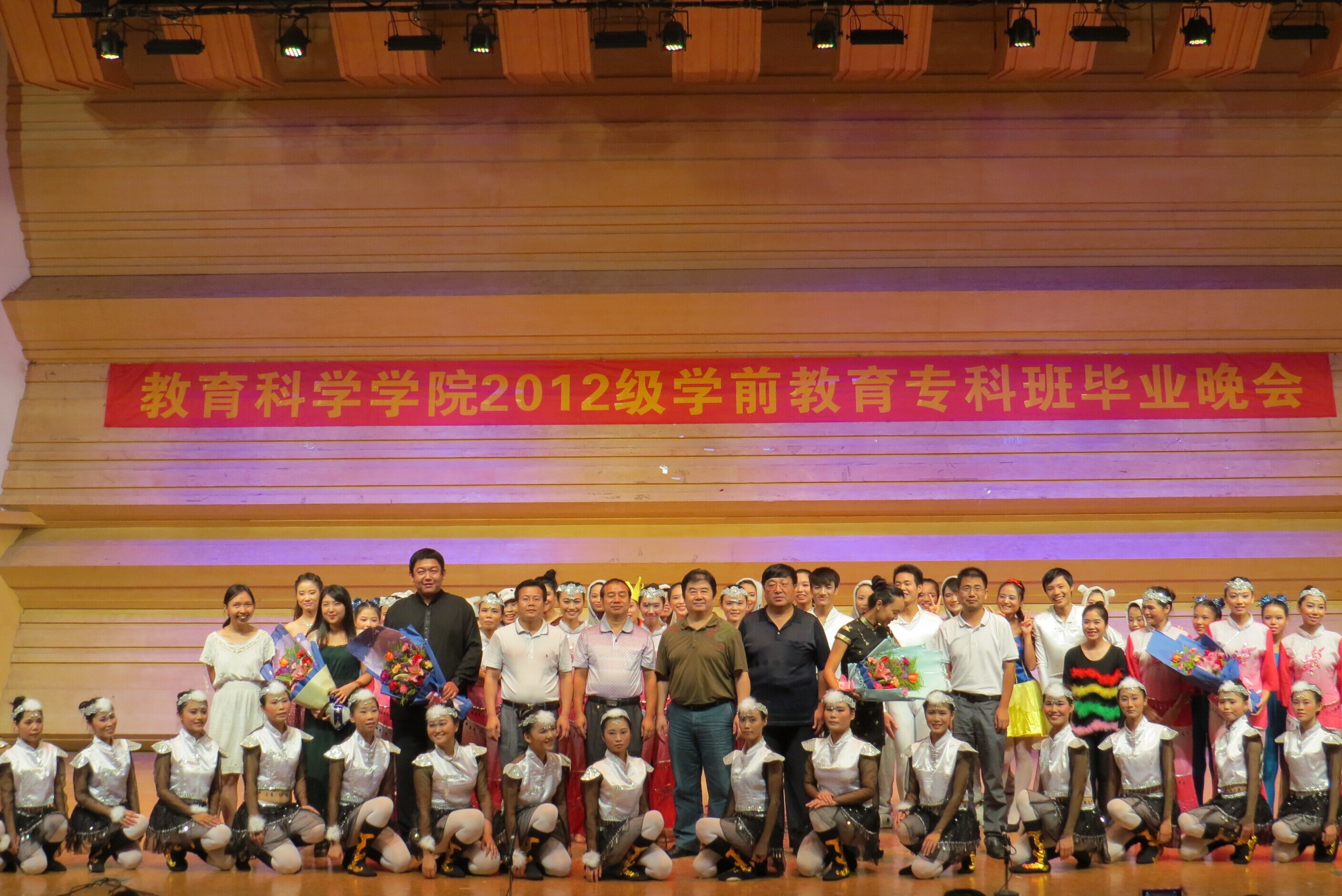 2014年9月27日晚,陈熹音乐厅座无虚席,教育科学学院2012级学前教育专科班毕业晚会在此隆重举行。william威廉中文官网和飞校长、教育科学学院徐杰书记、张旭东院长、文雪副院长、李炳全副院长、刘远君副书记和肇庆市部分幼儿园的园长、老师及教育科学学院师生共300多人出席观看了本次晚会。
