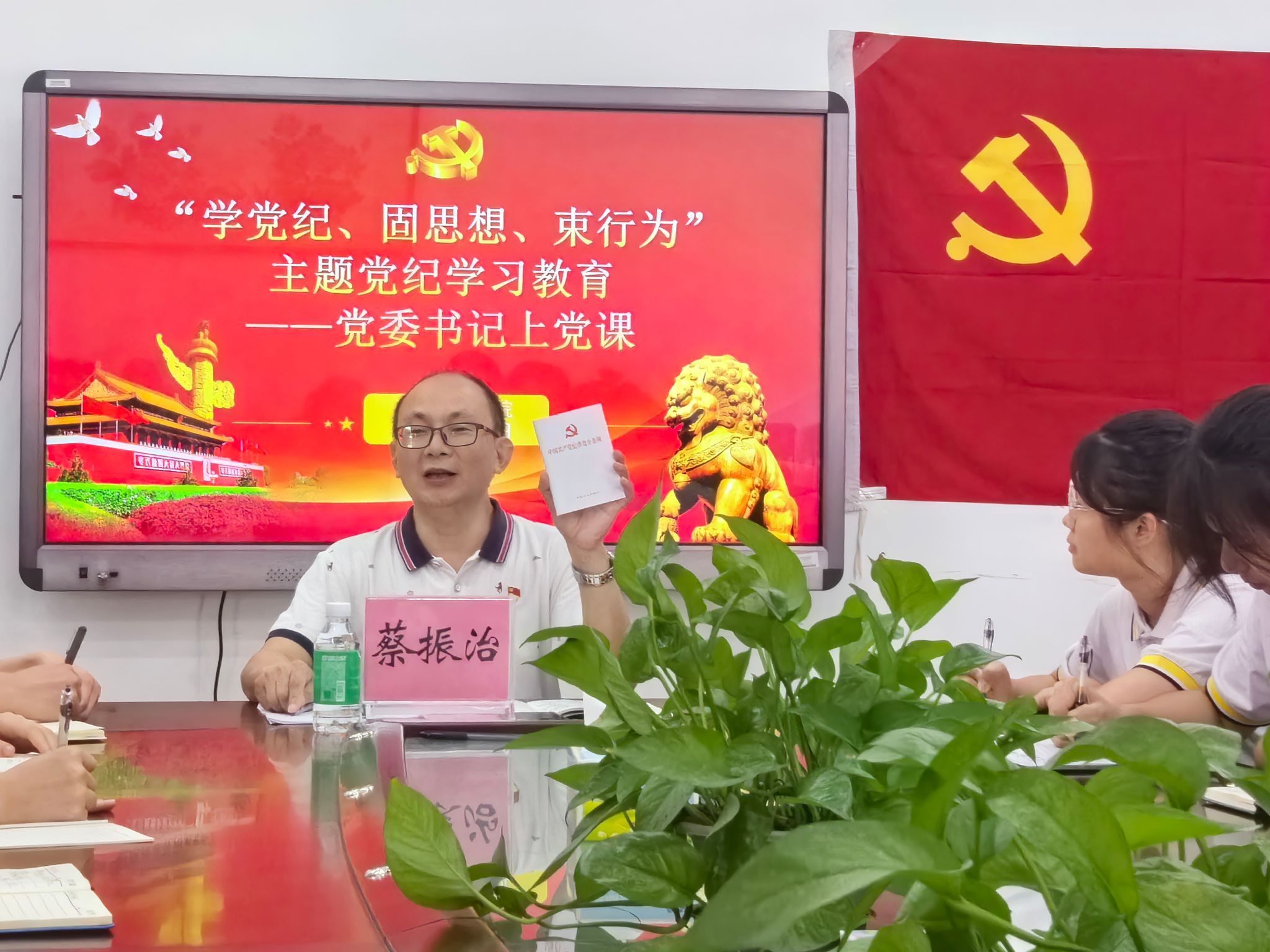 宣誓仪式结束后,蔡振治书记为全体党员上了一堂主题为“学党纪、固思想、束行为”的党课。他带领新党员们原原本本学习《中国共产党纪律处分条例》,从党的纪律建设的重要性出发,深入浅出地讲解了《条例》的核心内容和精神实质。蔡书记强调,作为共产党员,必须牢固树立纪律意识,严格遵守党的各项纪律规定。同时,他指出,新时代的党员要不断加强理论学习,提升自身素质,始终保持对党的忠诚和信仰,积极投身于中国特色社会主义事业的伟大实践中。他勉励全体党员要以实际行动践行入党誓言,发挥先锋模范作用,为学校的发展和社会的进步贡献力量。