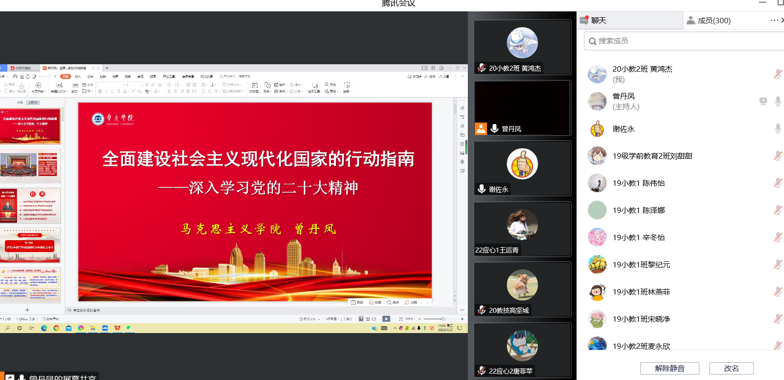 本网讯(通讯员/黄鸿杰 责编/何秀华)2022年12月7日下午,教育科学学院以线上会议的方式开展了党的二十大精神专题宣传会,由马克思主义学院曾丹凤副教授作辅导报告。教育科学学院党委书记谢佐永主持会议,教师党员、学生党员及学生代表等近300人参与本次宣传会。