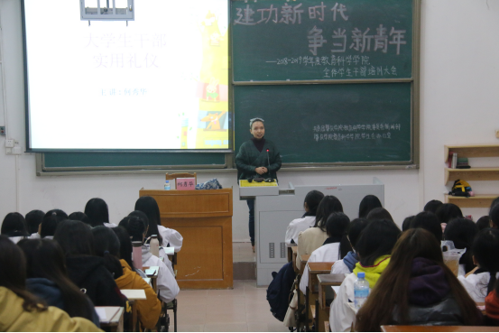 本网讯(通讯员 林燕霞 责编 刘晓彤)2018年12月9日-12月10日,由共青团教育科学学院委员会新闻部,教育科学学院学生会办公室联合举办的“建功新时代,争当新青年”2018-2019学年度教育科学学院全体学生干部培训大会分别在学生活动中心一楼大礼堂和第一教学楼101室举行。本次培训邀请到了学院党委副书记刘远君为大家开展关于学生干部培训的讲座,学院专职组织员何秀华老师主讲关于学生干部礼仪的培训。全体教育科学学院学生机构干部、班长、入党积极分子等二百余名学生参加了本次培训。