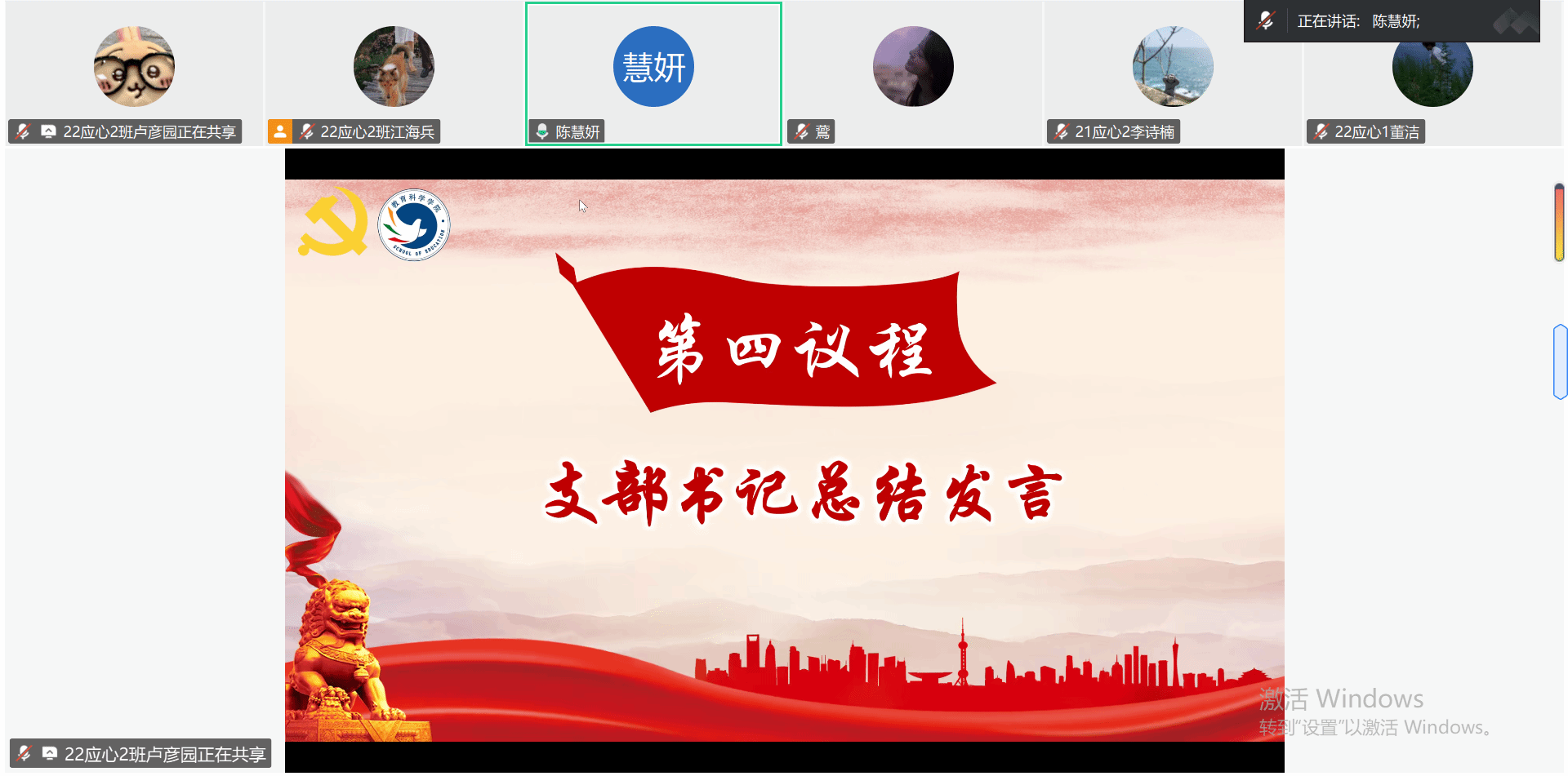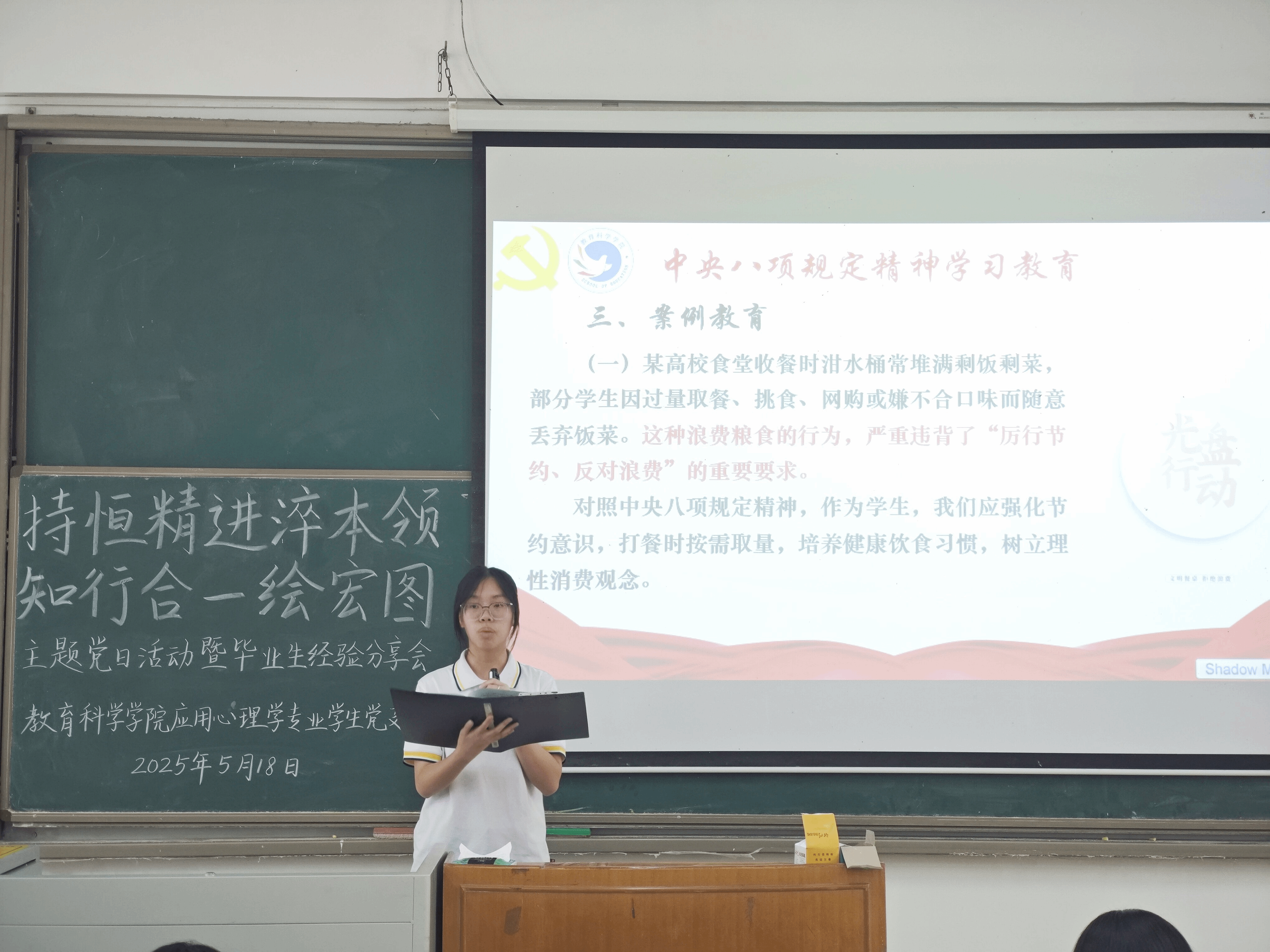 在第一议题环节,主持人卢彦园与林莉莉分别引领全体同学学习研讨 “传承五四精神,培育时代新人”与“深入贯彻中央八项规定精神学习教育”内容,旨在引导新时代师范生争做有理想、敢担当、能吃苦、肯奋斗的新时代好青年。他们强调,师范生作为未来教育主力军,要以“严以治学”为基石,以“德”润心为前提,以“行”践知为关键,促进自身成长并投身中国式现代化的教育实践。