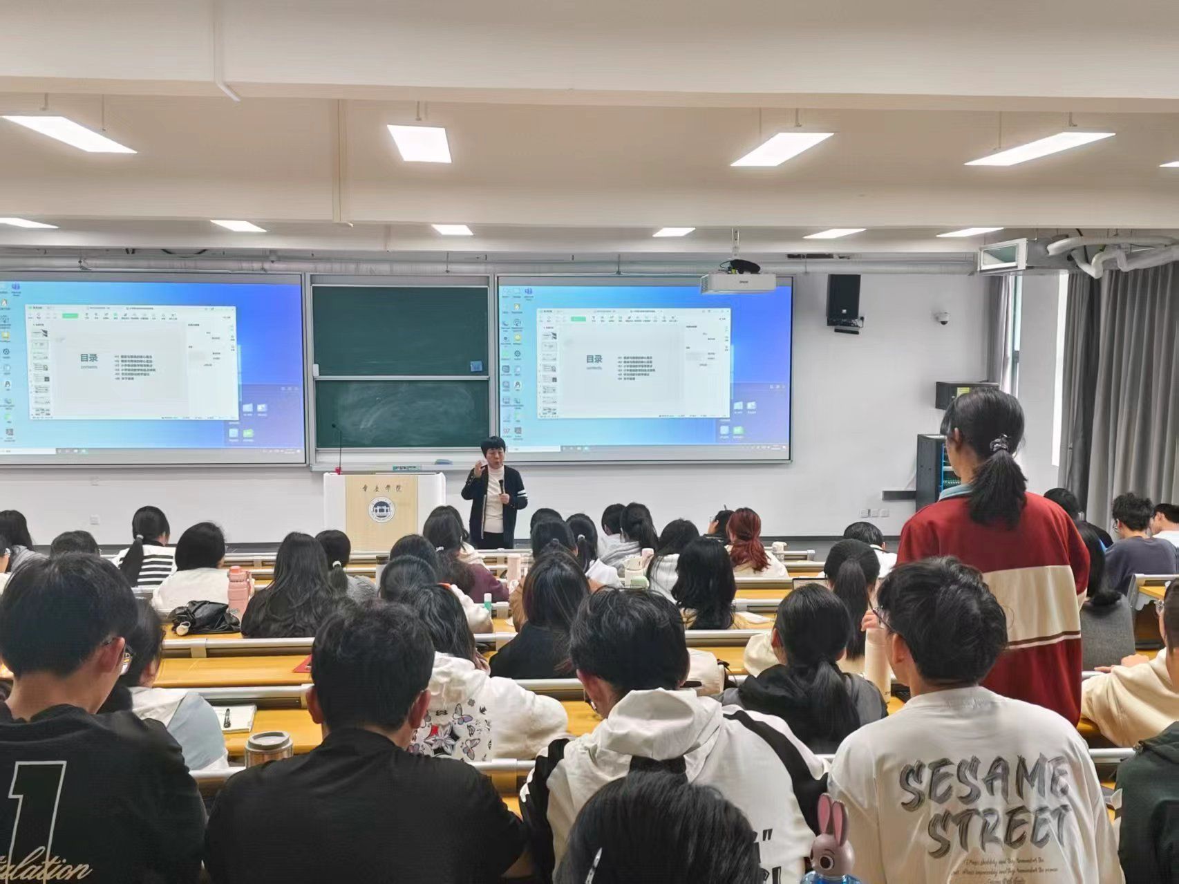 在互动交流环节,凌琳校长针对朗读教学中“学生假齐读”“文言文学习走神”及“小组合作效率低”等常见问题提供了具体的解决方案,如通过明确的规则引导、任务分解与角色分工等策略,并就一线教学中的难点与同学们进行了热烈探讨。最后,凌校长寄语在场学子,希望大家能将所学融入未来的教学实践,以精准指导、持续反思的态度深耕语文课堂。本次讲座不仅为师范生搭建了专业学习交流的平台,强化了大家对小学语文教学专业性的认知,更有效激发了大家提升专业素养、投身教育事业的热情与决心。