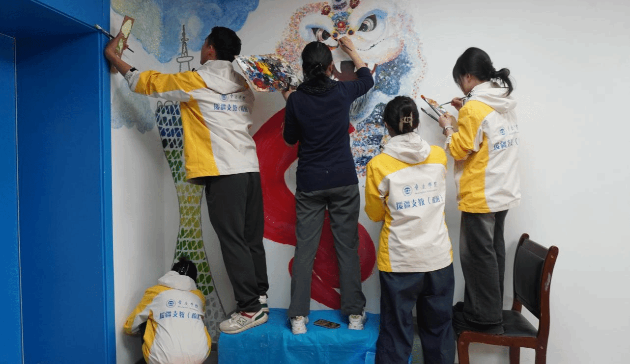 近日,第六批援疆支教服务队在新疆维吾尔自治区喀什地区疏附县中心幼儿园开展“粤韵绘童心”主题墙绘创作活动。