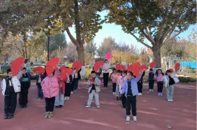 为了更好地让孩子们感受音乐之美,创造更多机会让孩子们体验音乐舞蹈活动的乐趣,我和队友陈冰共同创编了大班组幼儿器械操——《雪龙吟》。流行音乐与鲜红扇子的结合,极大地激发了孩子们的兴趣。