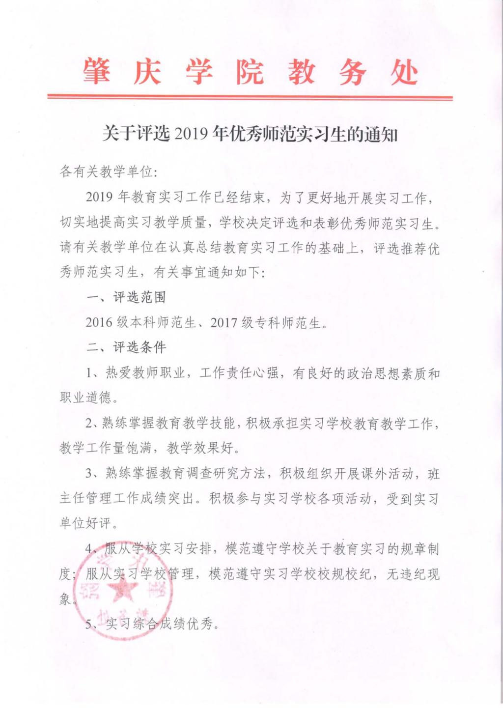关于评选2019年优秀师范实习生的通知